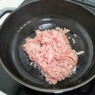 5.豚ひき肉に火が通ったら、新玉ねぎを加える。