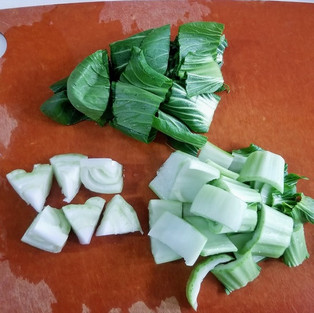 ・チンゲン菜 茎と葉で分けて切り、歯の部分はざく切りにする。 茎の部分は3㎝程度のざく切りにし、芯の部分は6等分にする。