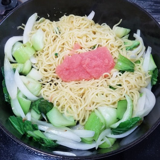 7.軽く炒めたら麺と水(分量外・大さじ2)を加えてよく炒める。 8.一旦火を止めてたらこを加えてよく混ぜる。 9.もう一度火をつけて、軽く炒めたら完成。