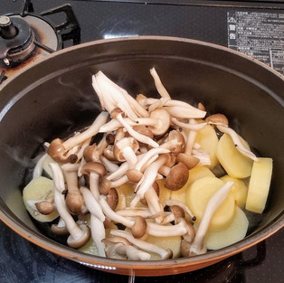 3.鍋にサラダ油を入れて中火にかける。 4.じゃがいもとしめじを加えて炒める。