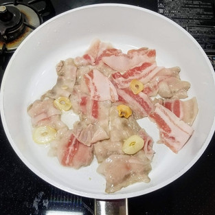 4.豚バラ肉を重ならいように入れて軽く焦げ目がつくまで焼く。