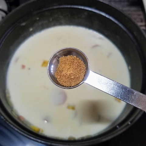 9.顆粒コンソメ、ガーリックパウダー、塩、黒胡椒を加える。