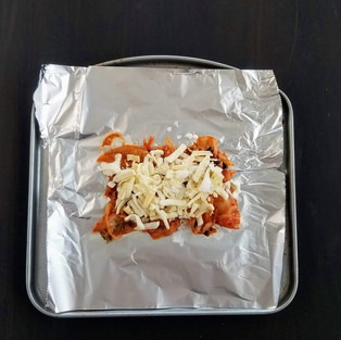2.鉄板にアルミホイルを引き、キムチを平らに置く。