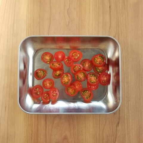 2.チェリートマトはヘタを取り、5㎜程度の幅に切る。