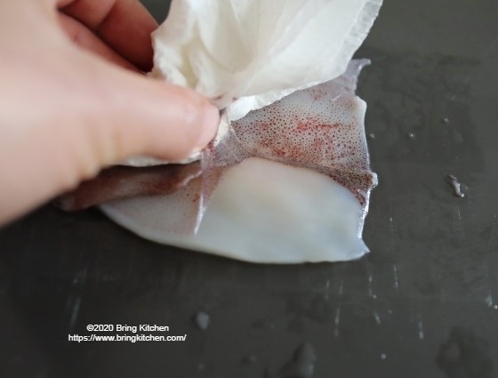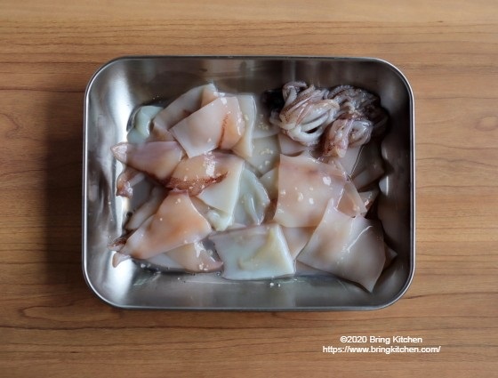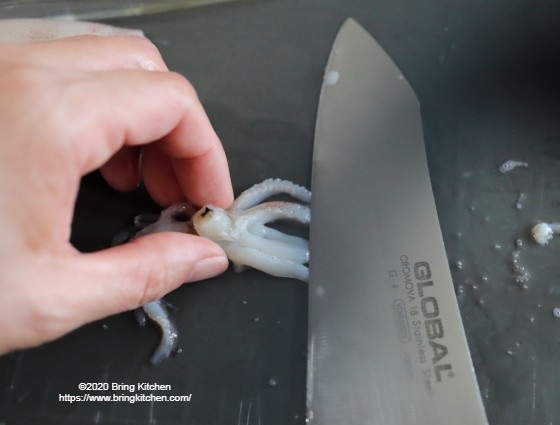 時間:30分 材料(2人分) ・イカ 4杯170g ・紫玉ねぎ 1/4個(100g) ・バジル 20g ・おろしにんにく 小さじ1/4 ・ごま油 大さじ1 調味料 ・酒 大さじ1 ・ナンプラー 小さじ2 下味 ・酒 小さじ1 ・塩 少々 作り方 1. イカをさばく。 胴体とゲソに分け、ナンコツを外す。 ゲソは包丁の背を使い、吸盤を落とす。 胴体は開き、皮を剥く。 食べやすい大きさに切り、下味をつける。