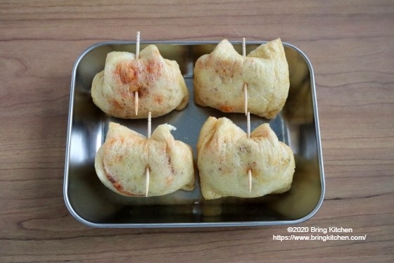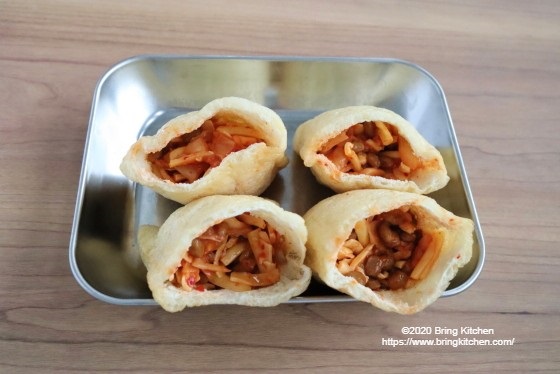 作り方 1. 油揚げはハサミで半分に切る。 2. ボウルにキムチを入れて、キムチをハサミで細かく切る。 3. 納豆、とろけるチーズを加えて、混ぜ合わせたら4等分に分ける。 4. 油揚げを袋状に開き、2.を詰めて楊枝で止める。 5. 鉄板にアルミホイルを引き、トースターで焦げ目がつくまで焼いたら完成。 (目安)10分~15分