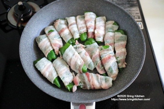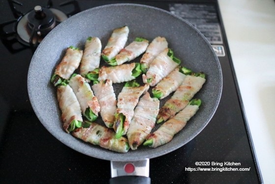 ポイント 焼くときは、豚バラ肉の巻き終わりを下にして焼き始めます。