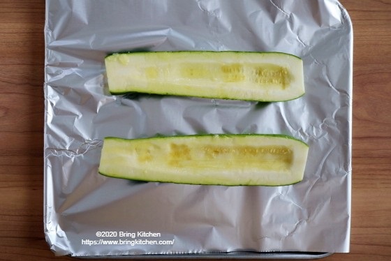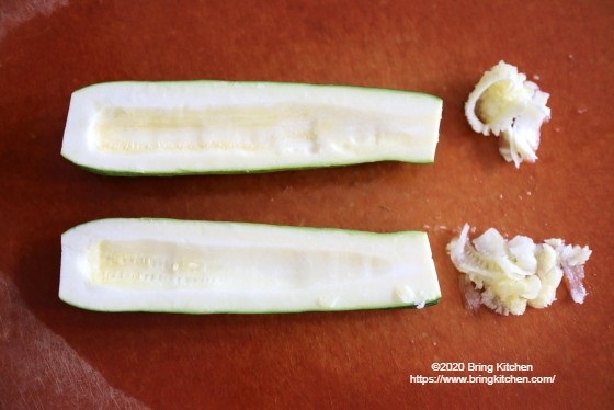ズッキーニの種をすくうことで、水っぽさが出ずに焼きあがります。