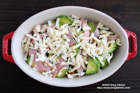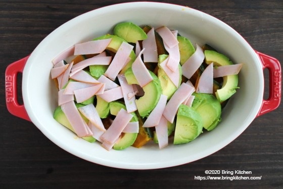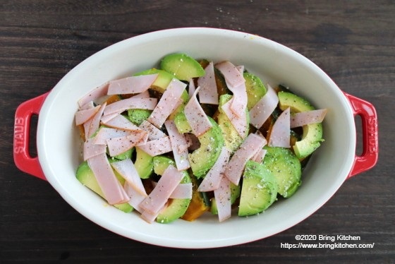 2. アボカドは皮を剥いて種を取り、1㎝程度の幅に切る。 3. ハムは半分に切った後、1㎝程度の幅に切る。 4. 耐熱皿にかぼちゃとアボカドを入れて、ハムを散らし、調味料を振りかける。 5. とろけるチーズを上からかけて、トースターで焦げ目がつくまで焼いたら完成。