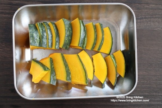 作り方 1. かぼちゃは1㎝程度の幅に切り、耐熱皿に並べ、食品ラップをふんわりとかけたら600Wの電子レンジで3分加熱する。