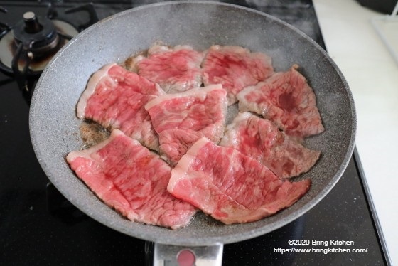 ポイント 牛肉から水分が浮いてきたらひっくり返す目安です。