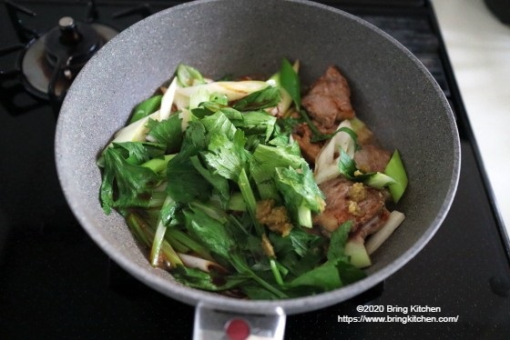 時間:20分 材料(二人分) ・豚肩肉(焼き肉用またはとんかつ用) 150g ・セロリ 1本(60g) ・長ネギ 1本(80g) ・おろしにんにく 小さじ1/4 ・ごま油 小さじ2 調味料 ・酒 大さじ1 ・めんつゆ 小さじ2 ・柚子胡椒 小さじ1 下味 ・酒 小さじ1 ・塩 少々 作り方 1. 豚肩肉に下味をつける。 2. セロリは筋を取り、1㎝程度の斜め切りにし、葉の部分はざく切りにする。 3. 長ネギも1㎝程度の斜め切りにする。 4. フライパンを中火にかけてごま油を入れ、フライパンが温まったら豚肩肉を入れて焼く。 5. 焦げ目がついたらひっくり返し、長ネギとおろしにんにくを加える。 6. 長ネギに油が回ったらセロリを加えて炒める。 7. 調味料を加えて全体が絡んだら完成。