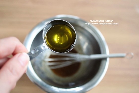 4. オリーブ油を少しずつ加えてよく混ぜたらドレッシングの完成。 5. 皿に春菊と柿を盛りつけてドレッシングを添えたら完成。