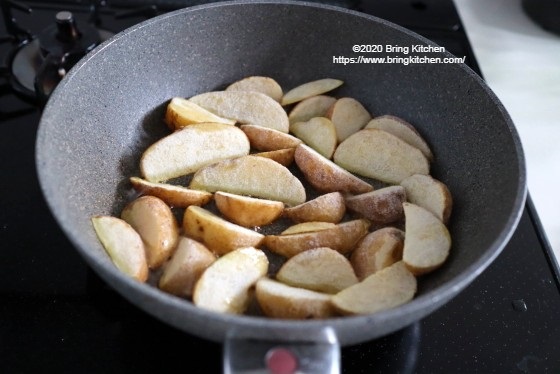 ポイント フライドポテトを入れたらなるべくいじらずに揚げ焼きにします。 冷凍フライドポテトは種類がありますが、太めのほうが美味しいです。