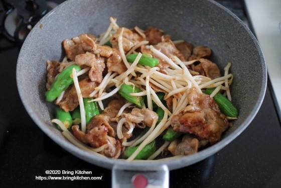 時間:20分 材料(2人分) ・豚こま肉 170g ・ししとう 50g ・もやし 100g ・鷹の爪 1本 ・おろしにんにく 小さじ1/2 ・ごま油 大さじ1 合わせ調味料 ・酒 大さじ2 ・砂糖 大さじ1 ・味噌 大さじ1 作り方 1. ししとうはヘタを落とし、大きいものは半分に切る。 2. もやしの根と髭を取る。(面倒なら省略しても) 3. ボウルに合わせ調味料の材料を入れて、混ぜ合わせておく。 4. フライパンにごま油と、鷹の爪、おろしにんにを入れて中火にかける。 5. にんにくから香りがしてきたら豚こま肉を広げながら重ならないように入れて焼く。 6. 焦げ目がついたらひっくり返しししとうを加える。 7. ししとうに油が回ったら、合わせ調味料ともやしを加える。 8. 全体を絡むように炒めたら完成。