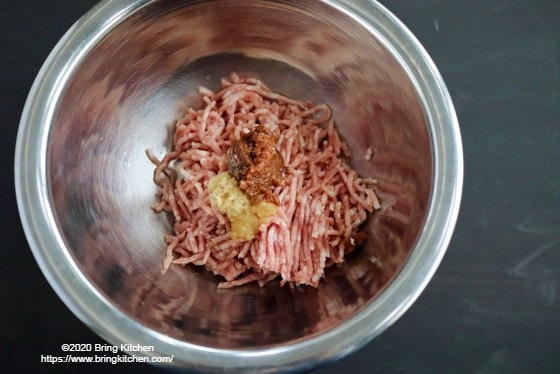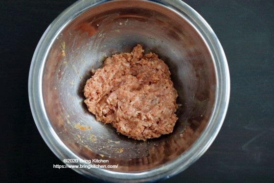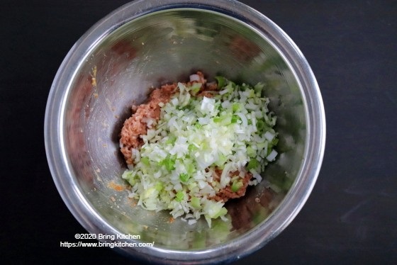 ポイント 挽き肉に調味料をしっかりと練り上げてからネギを加えます。