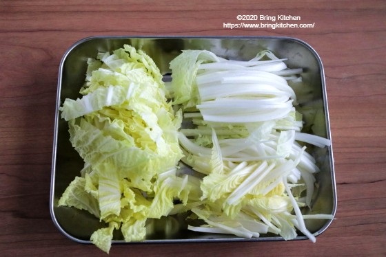 白菜は芯の部分を細く切るのがポイントで、油も回りやすく、味も絡みやすくなります。