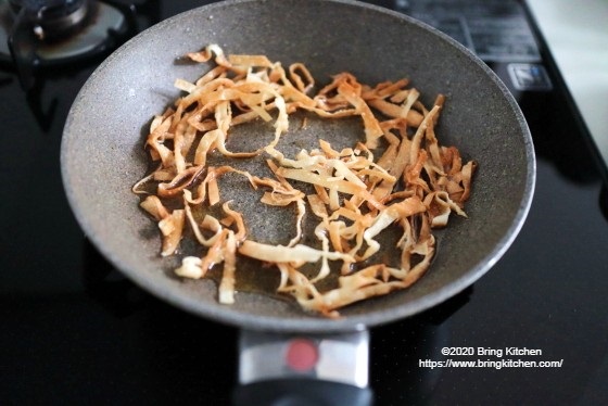 ポイント 揚げ焼きにしたワンタンの皮は油ごと白菜にかけます。 やけどに注意してください。