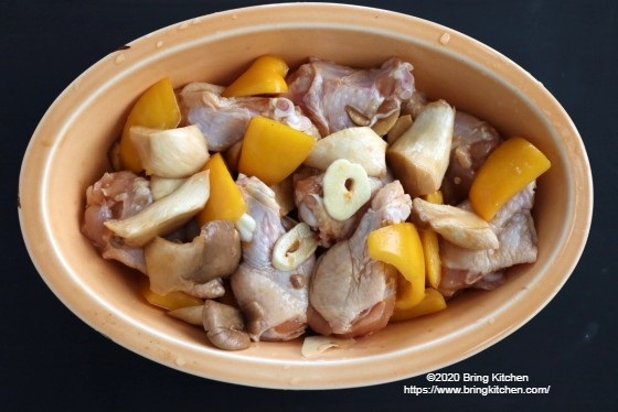 時間:60分 材料(2人分) ・鶏手羽中元 8本(450g) ・パプリカ 1個 ・エリンギ 1パック ・にんにく 1片 漬け込み用調味料 ・みかん 1個 ・醤油 大さじ1 ・塩 ふたつまみ ・オリーブ油 大さじ1 作り方 1. パプリカはヘタと種を取り、乱切りにする。 2. エリンギは軸を削るように落とし、乱切りにする。 3. にんにくは皮を剥いて薄切りにし、芯を抜く。 4. みかんは絞っておく。 5. ビニール袋にみかんのしぼり汁と漬け込み用調味料を入れ、手羽元、パプリカ、エリンギを入れて手で揉み、10分以上おく。