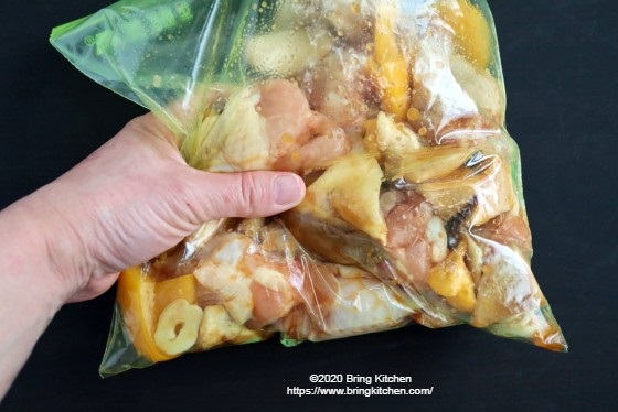 絞った果汁と醤油に漬け込んだ手羽元。