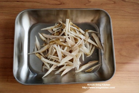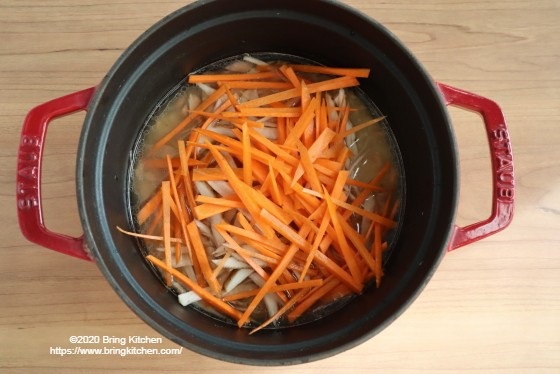 (20分程度) 2. 牛蒡はささがきにして、水にさらす。 4. 人参は皮を剥いて細切りにする。 5. 軽くオイルを切ったツナ缶と、牛蒡、人参を米に加える。 6. 炊く。