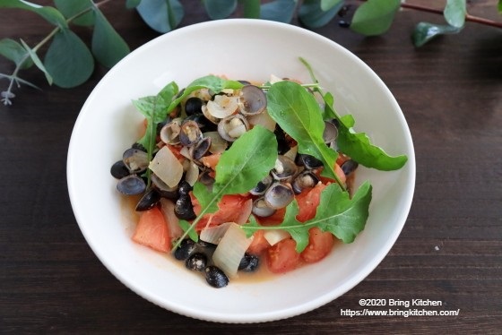 時間:10分 材料(2人分) ・しじみ 200g ・トマト 1個(200g) ・玉ねぎ 1/2(100g) ・おろしにんにく 小さじ1/4 ・オレガノ 小さじ1/2 ・オリーブ油 大さじ1 ・ルッコラ(飾り) 適量 調味料 ・白ワイン 大さじ1 ・塩 ふたつまみ ・黒胡椒 少々 作り方 1. トマトと玉ねぎは、食べやすい大きさに切る。 2. フライパンにオリーブ油を入れて中火にかけ、玉ねぎとおろしにんにくを入れて炒める。 3. 玉ねぎが半透明になったら、しじみと白ワインを加えて蓋をし、1分間蒸し焼きにする。 4. トマトとオレガノ、塩、黒胡椒を加えて全体が混ざるように炒める。 5. 皿に盛りつけてルッコラを飾ったら完成。