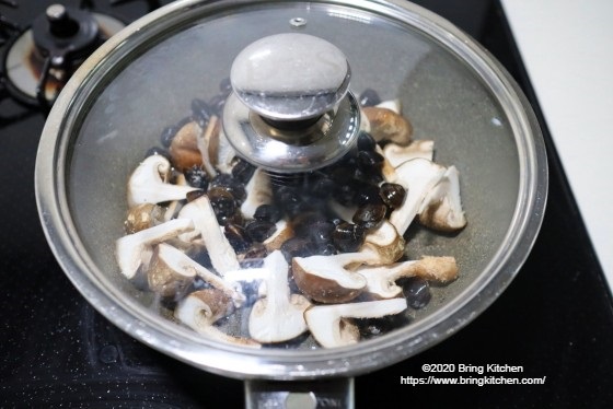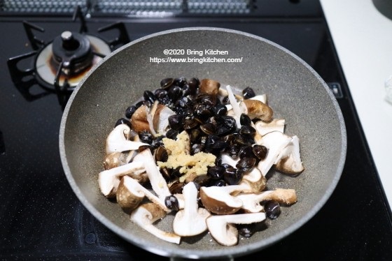 2. フライパンにしいたけ、しじみ、おろし生姜、酒、塩を入れて混ぜたら中火にかける。 3. 蓋をして5分間蒸したら完成。