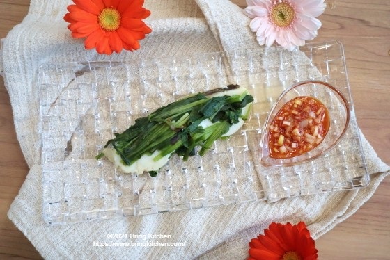 時間:15分 材料(2人分) ・福島県産 にら 1/2束(50g) ・鱈 2切れ(160g) 100g ・酒 小さじ2 タレ材料 ・長ネギ 20g ・おろしにんにく 小さじ1/4 ・豆板醤 小さじ1/2 ・砂糖 大さじ1 ・酒 小さじ1 ・ごま油 小さじ1 鱈下味 ・塩 少々 作り方 1. 鱈に塩を振り5分程度置いたら水分をペーパタオルで拭いておく。 2. 福島県産にらは5㎝程度の幅に切る。 3. アルミホイルに、にら→鱈→にらの順に重ねて、酒を振ったら包む。 4. 魚グリルで10分間蒸し焼きにする。 5. みじん切りにしたネギと調味料を混ぜ合わせてタレを作る。 6. 鱈を皿に盛りつけて、タレを添えたら完成。