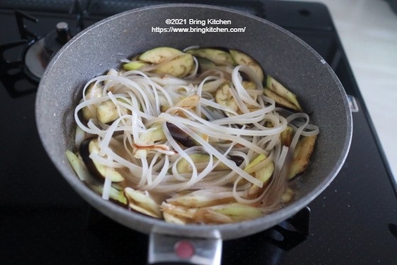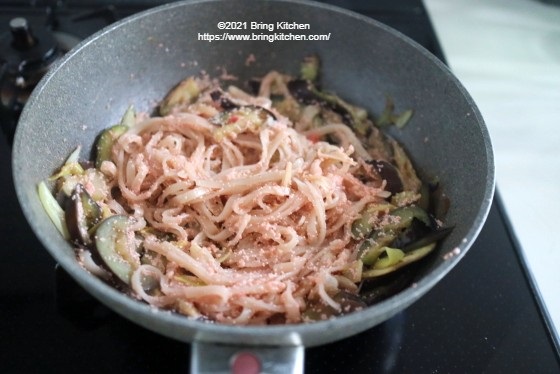 時間:20分(ビーフンの戻し時間は除く) 材料(2人分) ・ビーフン 80g ・たらこ 1腹半(50g) ・茄子 2個(150g) ・長ネギ 1/2本(70g) ・バター 10g ・サラダ油 大さじ1 ・水 100㏄ 調味料 ・塩 ふたつまみ ・黒胡椒 少々 ・酒(たらこほぐし用) 大さじ1 作り方 1. ビーフンは水に20分間程度浸す。 2. たらこと酒をボウル入れてほぐしておく。 3. 茄子はヘタを落として、茄子も縦半分に切った後、斜め切りにし水にさらし、灰汁を抜く。 4. 長ネギは斜め切りにする。 5. フライパンを中火にかけてサラダ油を加えたら、水気を切った茄子と長ネギ、塩、黒胡椒を加えて炒める。 6. ビーフンと水、中華出汁を加えてひと混ぜしたら、弱火にし、蓋をして3分蒸し焼きにする。 7. 中火に戻し、たらことバターを加えて、全体を混ぜるように炒めたら完成。