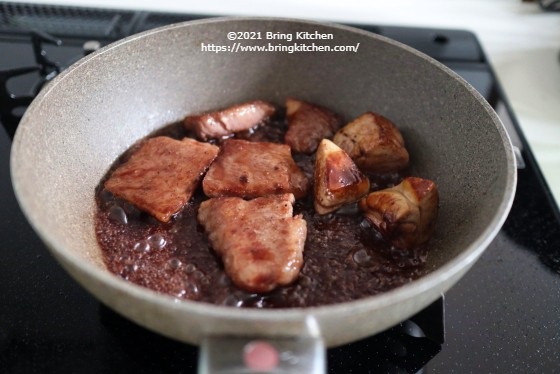 作り方 1. フォアグラと牛カルビ肉に下味をつける。 2. フフライパンを中火にかけてオリーブ油を入れて、弱めの中火でフォアグラを焼く。 3. フォアグラに焦げめが付き、中まで火が通ったらいったん取り出し、同じフライパンにラードを足して牛カルビ肉を焼く。 4. 余分な油を取り、調味料を加える。 5.ソースを絡めるように焼いたら完成。