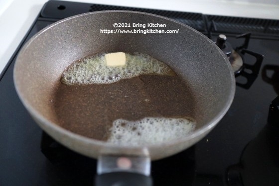 鶏肉から出た肉汁と、バターをかけながら焼くと、美味しく仕上がります。