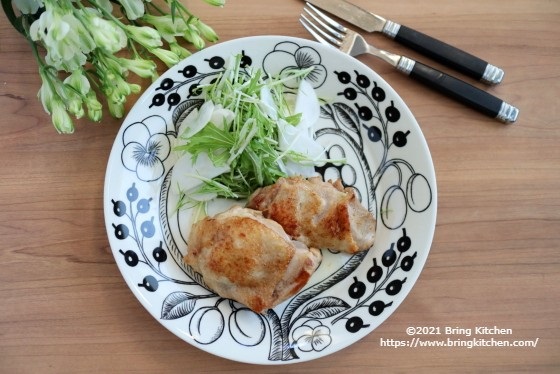 時間:20分 材料(2人分) ・鶏もも肉 2枚(500g) ・バター 15g 調味料 ・塩 小さじ1/4 ・GABANホワイトペパー 多め 付け合わせ 水菜 50g 蕪 50g 作り方 1. 鶏もも肉派は半分に切り、塩とGABANホワイトペパーを両面にまんべんなく振りかける。 2. 付け合わせの水菜は食べやすい長さに切り、蕪は皮を剥いて薄くスライスする。 3. フライパンを中火にかけて、バターを入れる。 4. バターが溶けたら鶏もも肉の皮目から焼く。 5. 焦げ目がついたらひっくり返し、蓋をして弱めの中火で5分程度焼く。 6. ひっくり返し、もう一度、皮目を焼く。 7. 付け合わせの野菜と盛りつけたら完成。