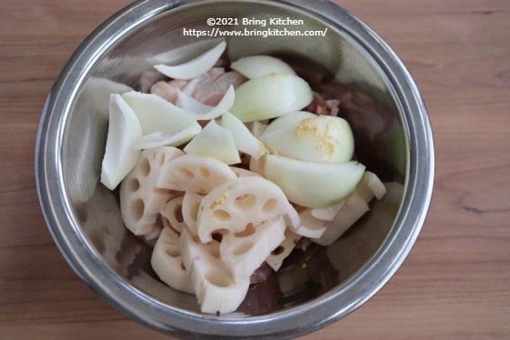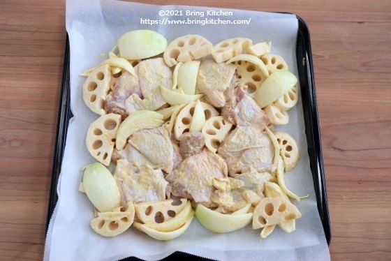 作り方 1. 鶏もも肉は、1枚を4等分に切る。 2. 蓮根は皮を剥き、2㎝程度の幅に切ったら水にさらし灰汁を抜く。 3. 玉ねぎはくし切りにする。 4. ボウルに調味料を入れて混ぜ合わせる。 5. 鶏もも肉、水気を切った蓮根、玉ねぎを加えて、よく混ぜ合わせる。 6.オーブン用鉄板にオーブンシートを2重に敷き、5.を重ならないように並べる。 7. 180℃に予熱したオーブンで、30分焼いたら完成。