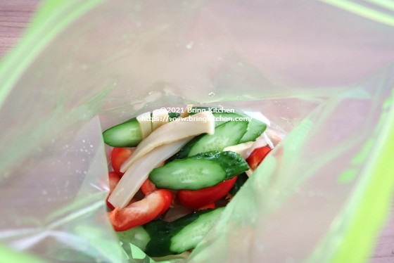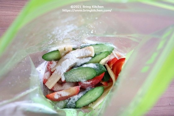 作り方 1. きゅうりは1㎝程度の斜め切りにし、赤パプリカはヘタと種を取り、縦1㎝程度の幅に切る。 2. メンマは一度茹でこぼし、水に取った後、水分をよく切る。 3. ビニール袋にきゅうり、赤パプリカ。メンマを入れて「すぐ漬けレモスコ味」を二袋加える。 4. 手でよく揉み、空気を抜いて口を閉じたら、冷蔵庫で冷やす。
