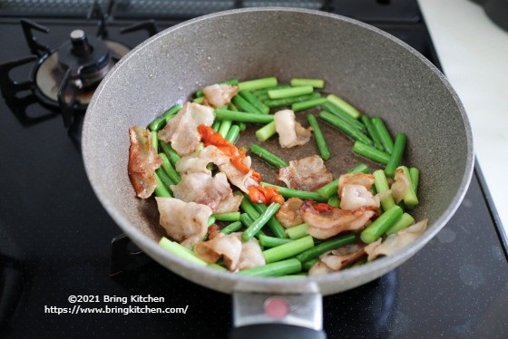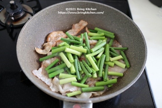 時間:20分 材料:2人分 ・にんにくの芽 1束(130g) ・豚バラ肉(薄切り) 100g 調味料 ・ハウス 魅惑のハリッサ 小さじ2 ・塩 少々 ・黒胡椒 少々 ・サラダ油 小さじ2 作り方 1. にんにくの芽と豚バラ肉は食べやすい大きさに切る。 2. フライパンを中火にかけてサラダ油を入れ、豚バラ肉を焼く。 3. 焦げ目がついたらひっくり返し、にんにくの芽と塩を加えて炒める。 4. 余分な油を取ったら、一旦火を止めて、ハウス魅惑のハリッサと黒胡椒を加える。 5. 全体に混ざったら火をつけて、軽く炒めたら完成。